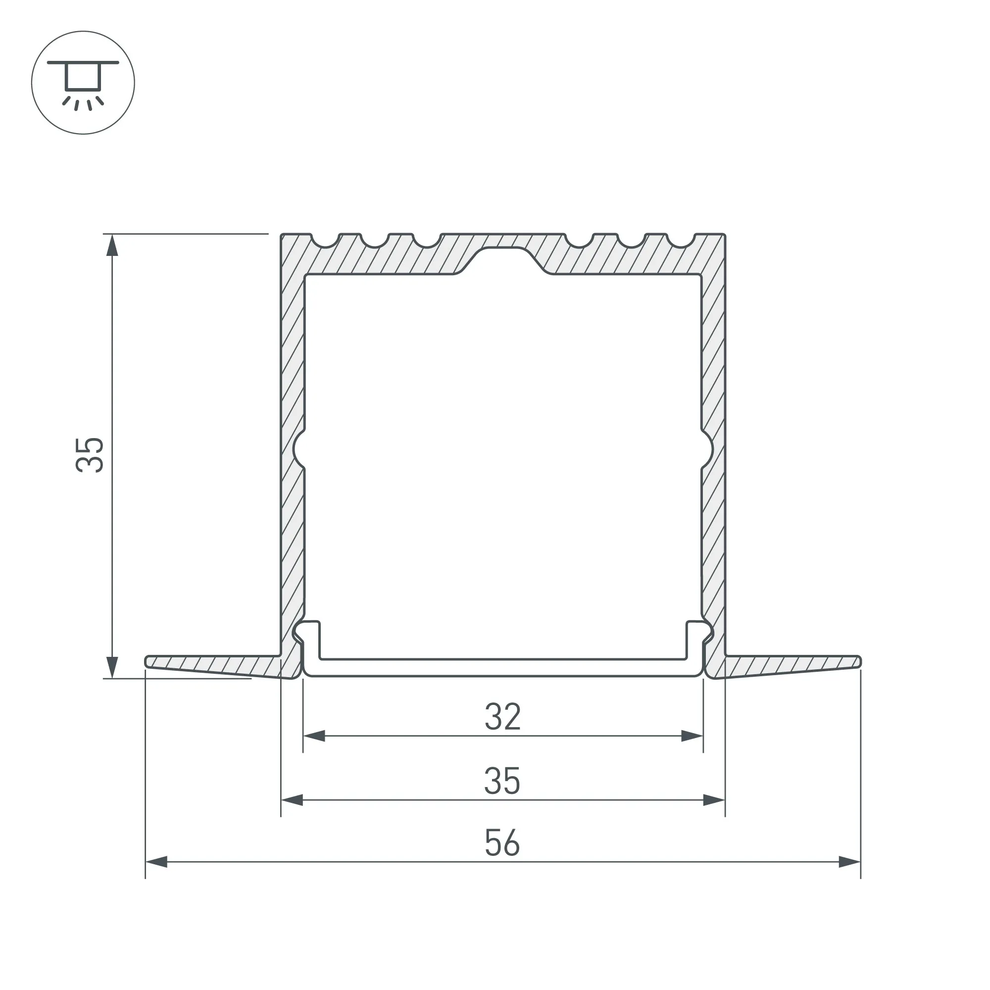Алюминиевый анодированный встраиваемый профиль для светодиодных лент и линеек. Паз для установки 35мм. Габаритные размеры (L×W×H): 2000x56x35 мм. Ширина площадки для ленты 32 мм. Экраны, заглушки и другие аксессуары приобретаются отдельно. Цена за 1 метр.