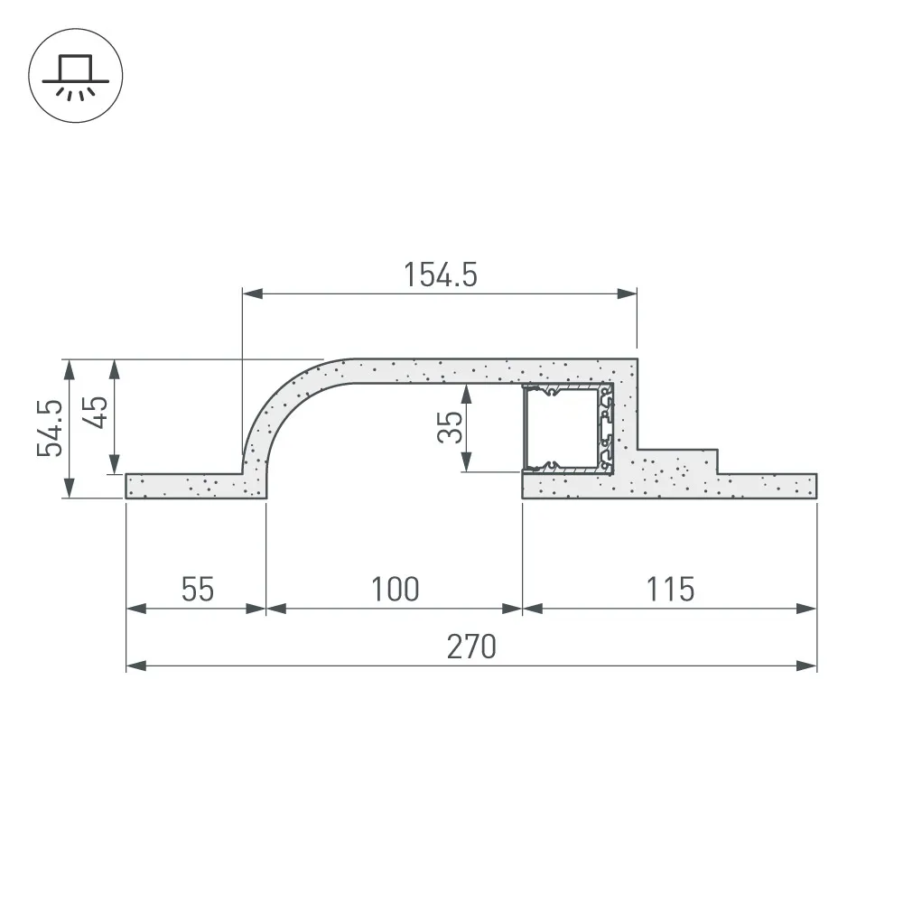 Гипсокартонный модуль серии BAY со встроенным алюминиевым профилем . Внешний вид - полукруглая ниша с боковой линией света (ширина 32 мм). Создаёт эффект отражённого света. Размеры модуля: ширина - 270 мм, высота - 60 мм, длина -2000 мм. Толщина гипсокартона: 9,5 мм. Матовый экран в комплекте. Поставляется не зашпаклеванным. Цена за 1 м.