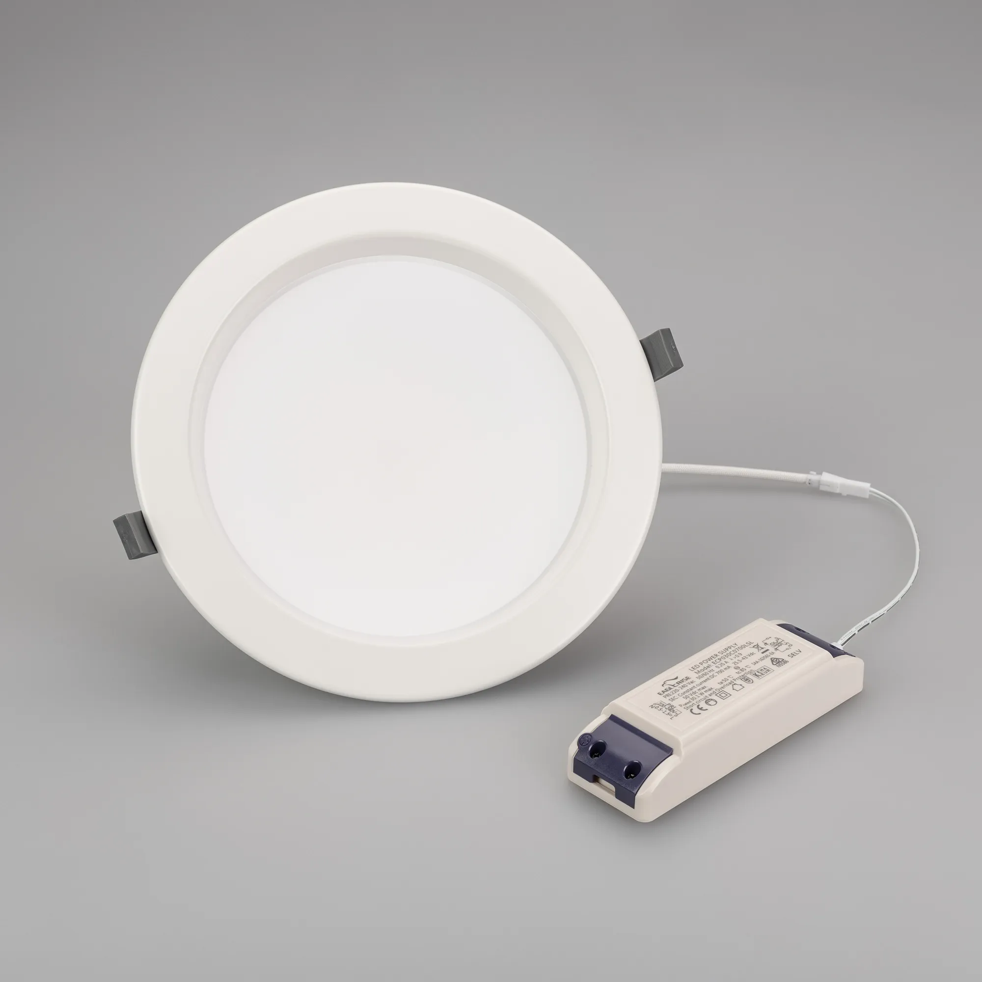 Встраиваемый светильник "Даунлайт" 30Вт. Цвет свечения БЕЛЫЙ 6000К. Световой поток 2820лм, угол 90°, CRI>80. Белый корпус. Питание AC220-240V. Габариты: Ø230х75мм, врезное отверстие Ø192-210мм. Драйвер в комплекте (25-43V, 700mA).