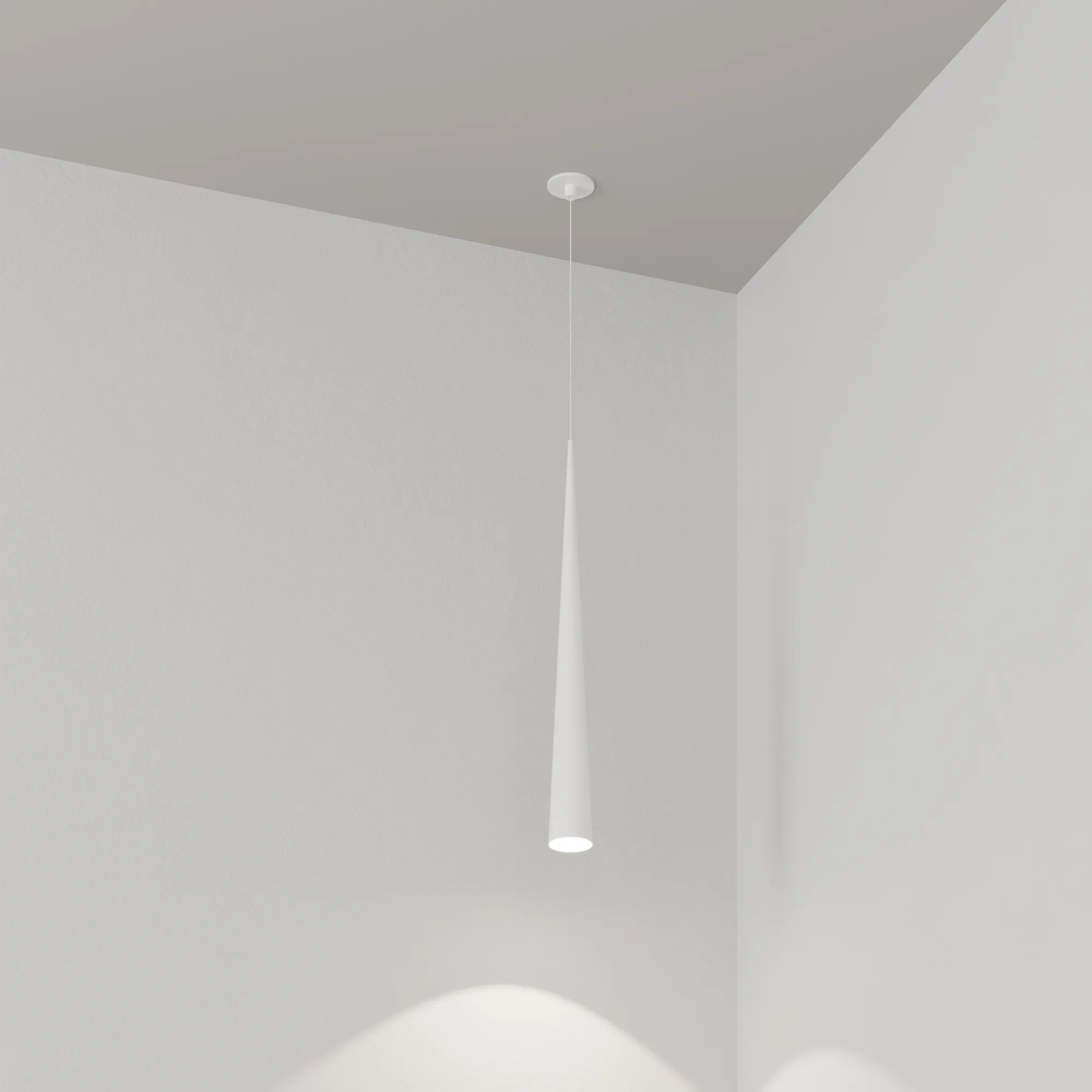 Подвесной светильник. Мощность 5 Вт, св. поток 400 лм, 70 лм/Вт, теплый 3000K, CRI>92, угол 36°, напряжение питания 230 В. Белый конусообразный вытянутый корпус из алюминия, линза из PMMA, степень защиты IP20. Размер: диаметр 76 мм, высота 670 мм. Монтаж подвесной, длина подвеса 2000 мм, регулируемая. В комплекте 2 вида чаш. Габариты встраиваемой чаши: Ø 80x41 мм. Габариты накладной чаши Ø80x60 мм. Драйвер 2,8-12В, 500 мА, пульсация <1%.